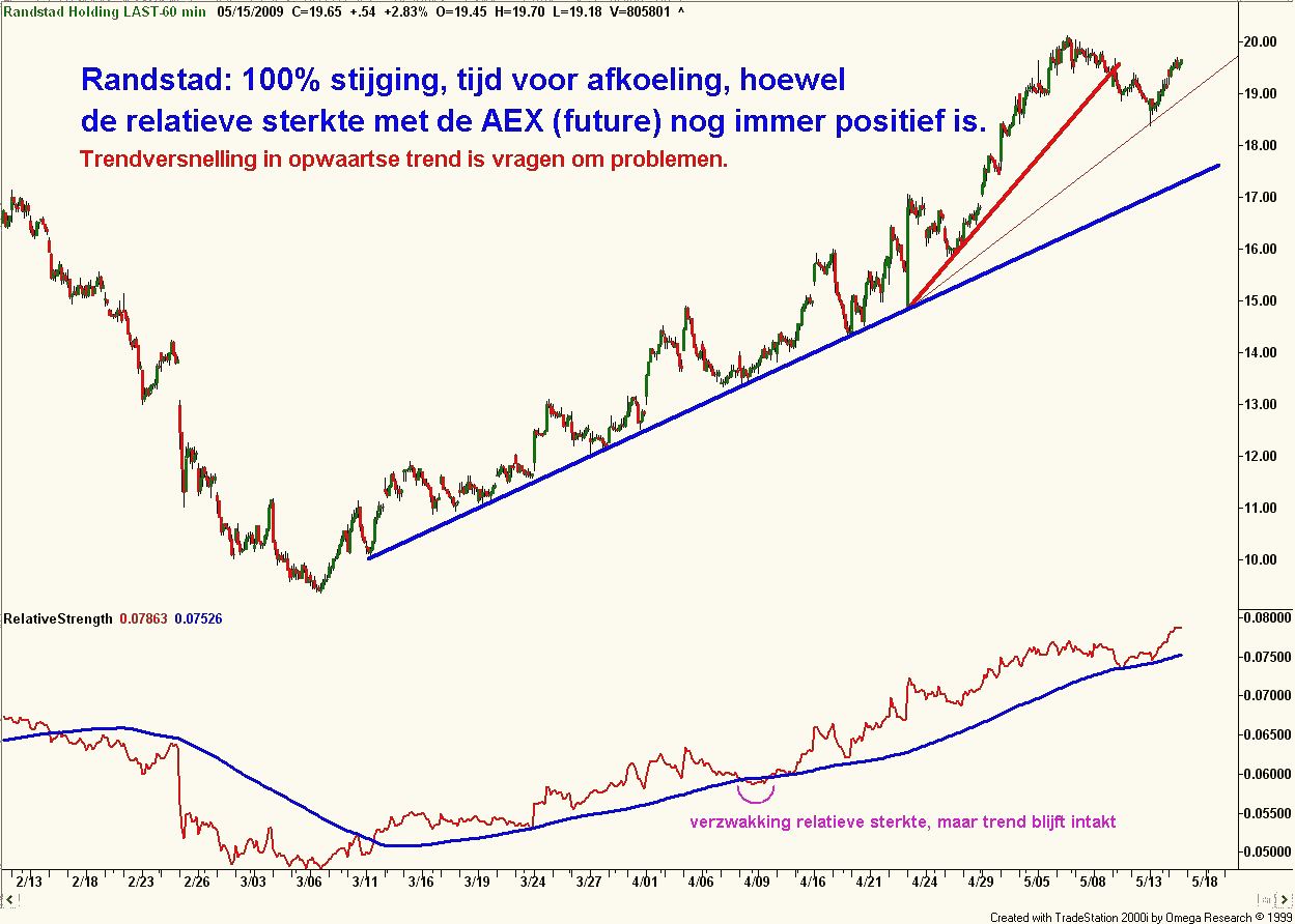 In een vorige analyse gaf ik reeds aan een verdubbeling van Randstad te verwachten. Welnu, zie grafiek, ze is al 100% gestegen vanaf de low. U ziet dat de relatieve sterkte nog steeds op mooi weer staat, ofwel de beurs gaat gewoon hoger. Aan de andere kant is een 100% stijging wel een Gann- waarde die significant is en derhalve weerstand biedt.