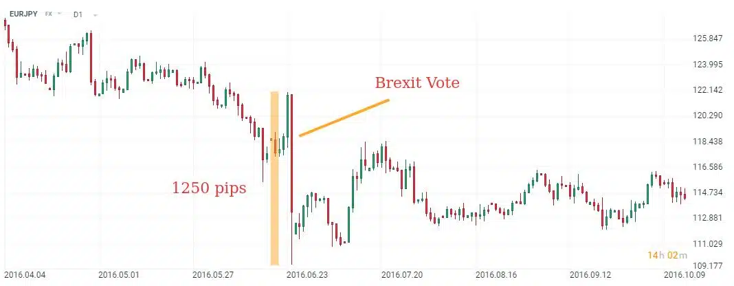 De eerste ronde van de Franse presidentsverkiezingen zal gehouden worden op 23 april en de beslissende tweede ronde op 7 mei. Als Le Pen wint, dan kunnen handelaren overwegen om een shortpositie in EURJPY te nemen. De euro kan onder druk komen en de Japanse munt wordt dan gebruikt als vluchthaven. De beweging van het valutapaar na de Brexit-referendum was binnen een dag circa 1250 pips.