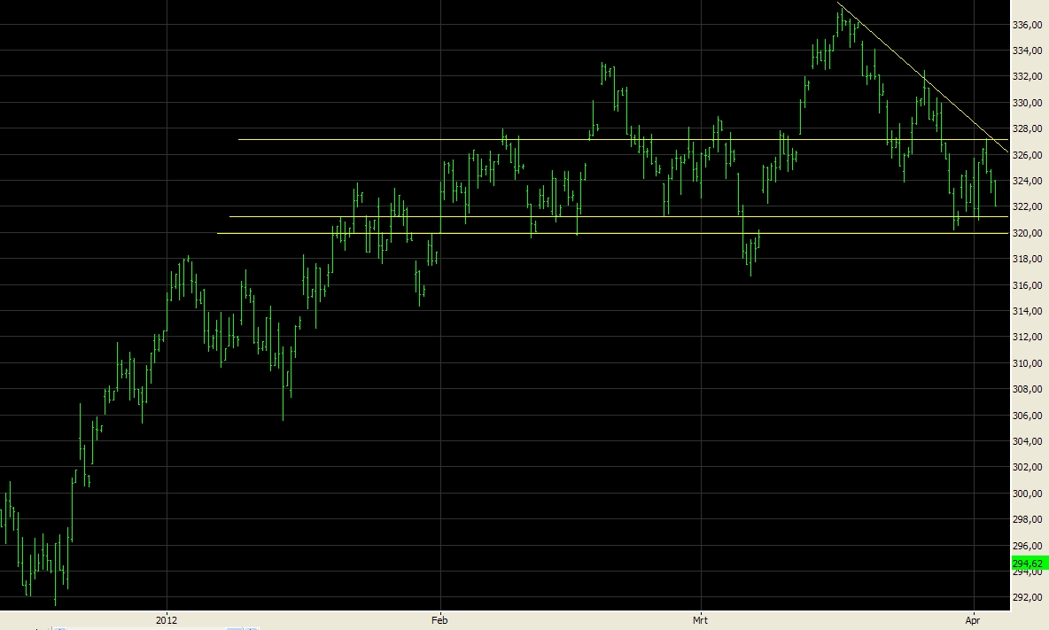 De AEX ketste vandaag af op de weerstandslijn bij circa 327 punten waarna de beurs omlaag dook. Wij zaten een klein deel van de rit short waarmee we netto 30 euro verdiend hebben.