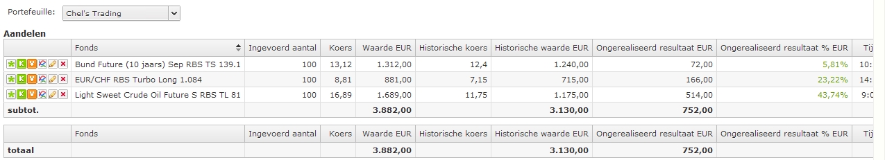 Recent zijn posities ingenomen op de Zwitserse frank en de Duitse Bund Future. Op het valutapaar EUR/CHF is long gegaan en short op de Duitse obligaties. Er wordt ingespeeld met Turbo’s. Deze posities tezamen met de belegging in olie staan op een gezamenlijk mooie winst van 750 euro.