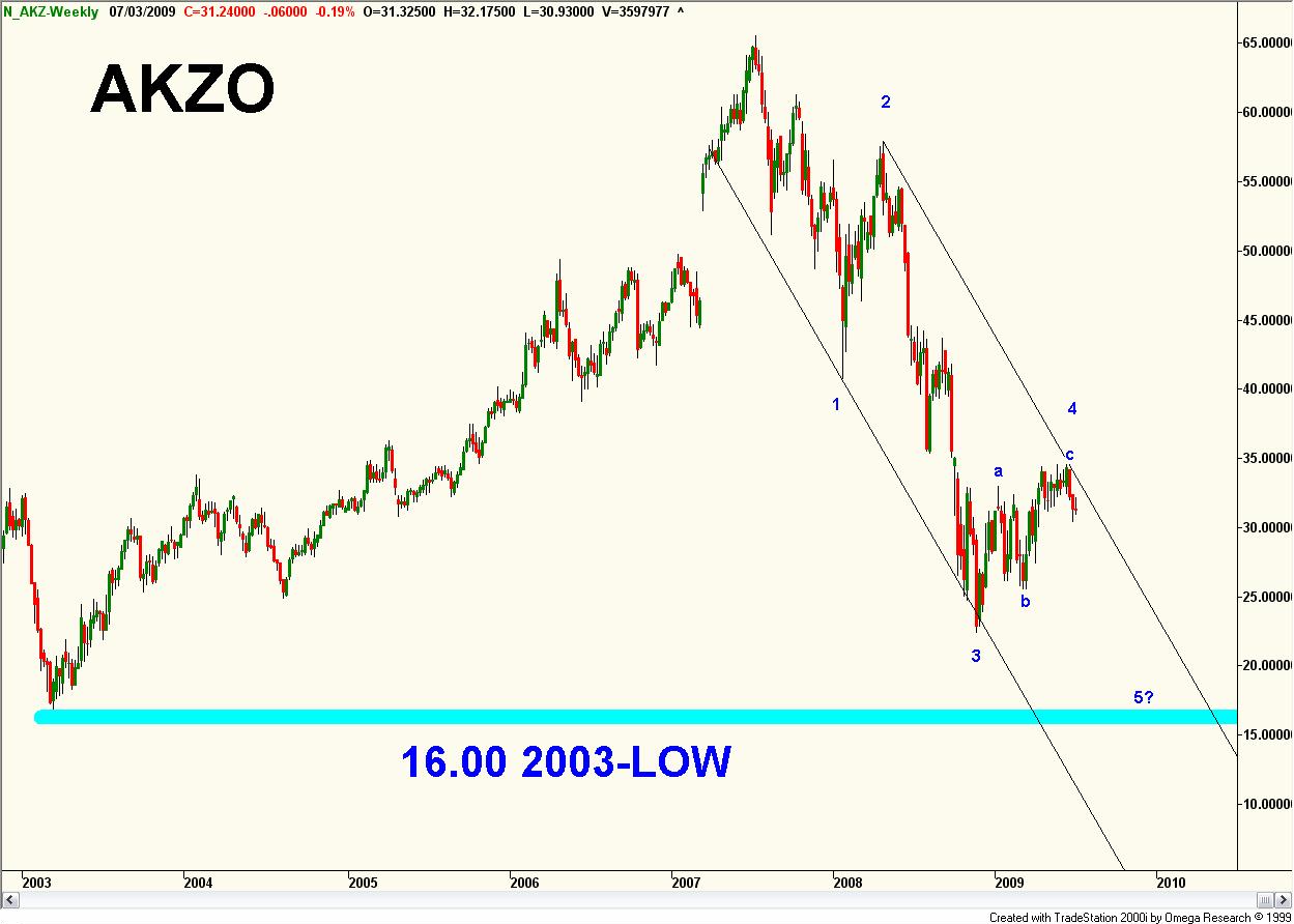 De tip van deze week is een trade in AKZO. De weekgrafiek maakt duidelijk dat als er een fonds is die rake klappen kan krijgen, AKZO hoge ogen gooit. Het fonds heeft aan zeer interessante voorwaarden voldaan om een duikvlucht te starten, die vermoedelijk al onderweg is. Als u dan ook nog bedenkt dat AKZO ondanks de vrije val van 2008, relatief als witte raaf fungeerde door ver BOVEN de maart 2003-bodem te blijven, dan lijkt me nu een aangewezen moment het voorbeeld van veel AEX- broertjes en zusjes maar eens te gaan volgen door die oude bodem maar eens op te gaan zoeken