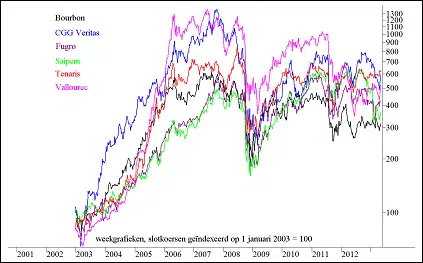 De Europese notering van Tenaris dateert van eind 2002, dus wij hebben alle koersen geïndexeerd op 1 januari 2003 om de ontwikkeling enigszins vergelijkbaar te maken. Helemaal compleet zijn wij dan niet, want er is in de grafiek geen correctie aangebracht voor de uitgekeerde dividenden. CGG Veritas bijvoorbeeld heeft in de afgelopen 12 jaar nimmer een dividend uitgekeerd, terwijl de anderen ook nog eens niet allemaal dezelfde pay-out ratio hanteren. Dit soort verschillen komen in de volgende artikelen, wanneer wij op de individuele ondernemingen ingaan, nog nader aan de orde.