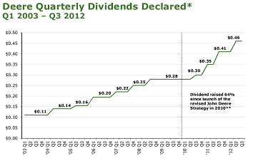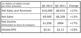 Dit is ook te merken aan de resultaten van John Deere. Wereldwijd worden er veel investeringen gedaan in de landbouw. Dit is een gevolg van relatief hoge voedselprijzen. De omzet in het tweede kwartaal van 2012 steeg met 12% tot $ 10 miljard. De winst in het tweede kwartaal van 2012 kwam uit op ruim $ 1 miljard. Vooral Canada en Amerika laten een groei zien. De verkopen stegen daar met ruim 18%. Buiten Canada en Amerika stegen de verkopen met 6%. Ook voor het tweede halfjaar van 2012 worden hogere winsten verwacht. De verwachte winst voor 2012 bedraagt $ 3,35 miljard. De strategie van John Deere is erop gericht om tot 2018 te groeien naar een omzet van $ 50 miljard. Dit moet met name worden bereikt door ruime investeringen in innovatie en uitbreiding van de algehele capaciteit. Momenteel lopen er meerdere projecten, waaronder het opzetten van 7 nieuwe fabrieken. In 2012 heeft John Deere een record aan nieuwe producten op de markt gezet. Het is dan ook een van de meest innovatieve fabriekenten van trekkers en landbouwmachines. Dat blijkt uit een onderzoek uitgevoerd door Eichbach Consulting.