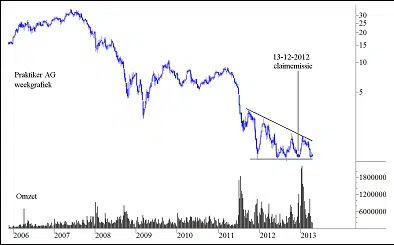 Op de beurs (Duitsland en Luxemburg) zijn aandelen van Praktiker genoteerd evenals een obligatielening. De aandelen staan al sinds 2005 genoteerd. In figuur 2 hebben wij de koersontwikkeling van het aandeel op weekbasis opgenomen.