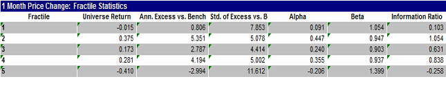 In de tweede kolom vinden we het gemiddelde rendement van de kwintielen met een maandelijkse herbalancering. Het herbalanceren per kwartaal levert ongeveer dezelfde waarden op voor de rendementen, alpha, beta en informatie ratio (IR) (hoe hoger des te beter) van de kwintielen zoals weergegeven in tabel 1.